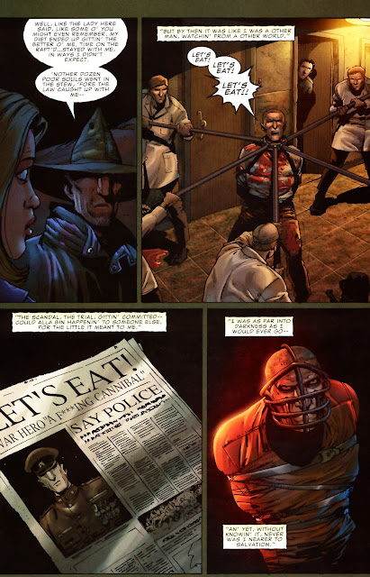 The military gave him a psych discharge, considering no other members of his regiment would work with him. The Army was the only home he had ever known. Without it, Pilgrim decided it best to drink his life away. One night, after getting sloshed at a bar, he hit a hobo with his car. Pilgrim gazed upon the man he had just killed and rather than feeling remorse, he thought of a recipe. He discovered he still had cravings for flesh and human stew was on the menu. The authorities caught wind of people disappearing and Pilgrim got himself locked up.