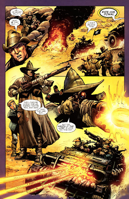 I’m not here to spoil the remainder of this five issue series. Wanna read the rest? Up to you my friend. But wait there’s more! If you do dig it, there’s also a sequel named Just A Pilgrim: Garden Of Eden. Trying new comics is never a bad thing. Right now, I’d prefer to focus on that whole “carbon copy” bit I brought up earlier. For fans of Preacher not only does Pilgrim have a similar look. The attitude also carries over. Pilgrim is more of a talker as he spouts out scripture in the middle of a massacre yet the strong but silent, movie westerns archetype is applicable to both. They’re also bad dudes who didn’t want redemption and would rather rot away, accepting that to be the fate of the wicked.