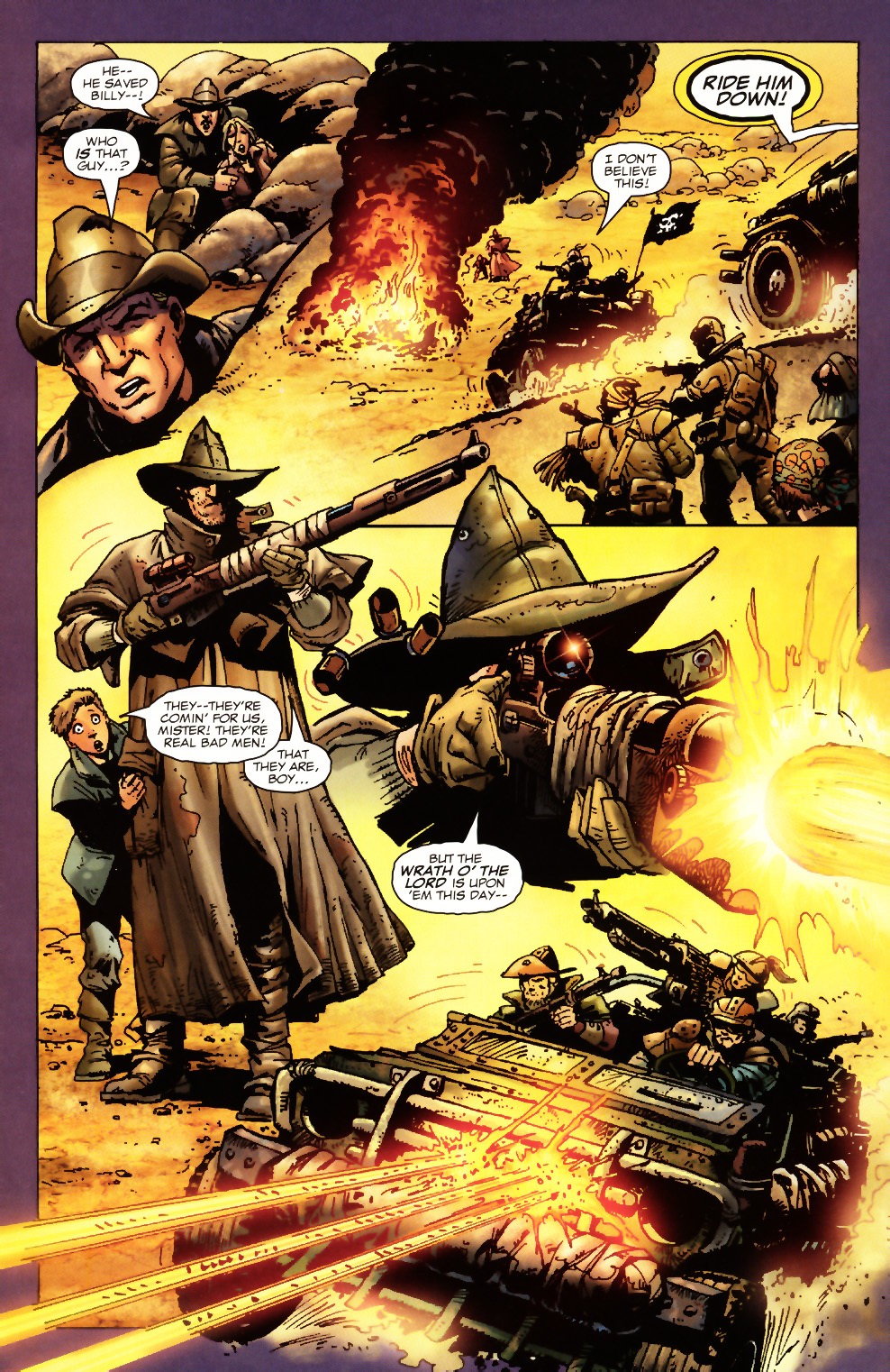 The narrative is told by a little boy named Billy Shepard via the pages torn from his diary. They tell of how the Earth suffered a cataclysm called “The Burn” that has destroyed most of the surface areas and led the oceans to dry up. Billy along with his family and a wandering caravan found themselves under assault by pirates when a righteous stranger arrived in time to save them. When asked who he is, surrounded by fire and death, the mystery man raises his head revealing the shape of a cross seared into his face and responds “Just A Pilgrim.”